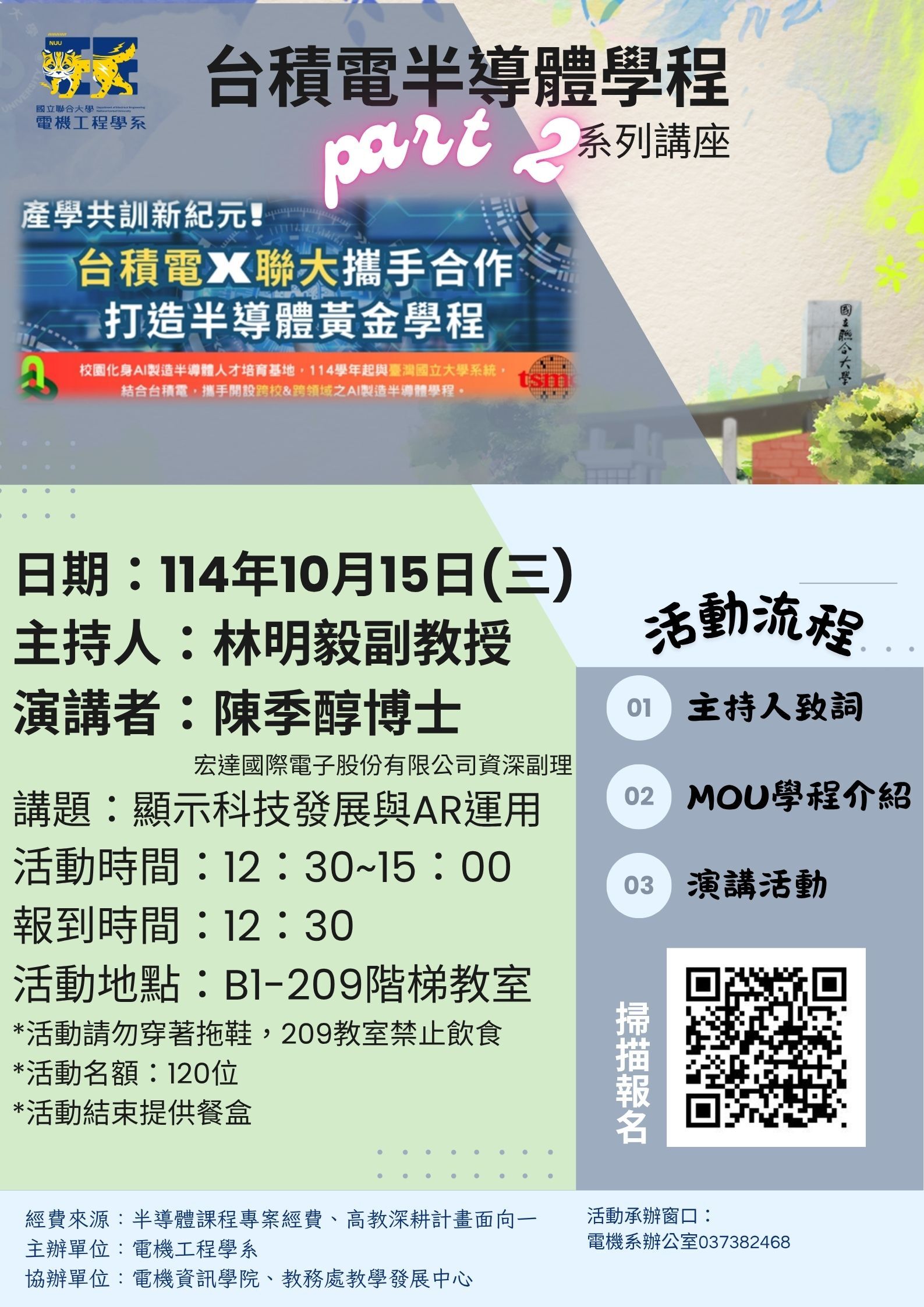 電機系【半導體講座活動系列】:台積電半導體學程演講第二場10/15
