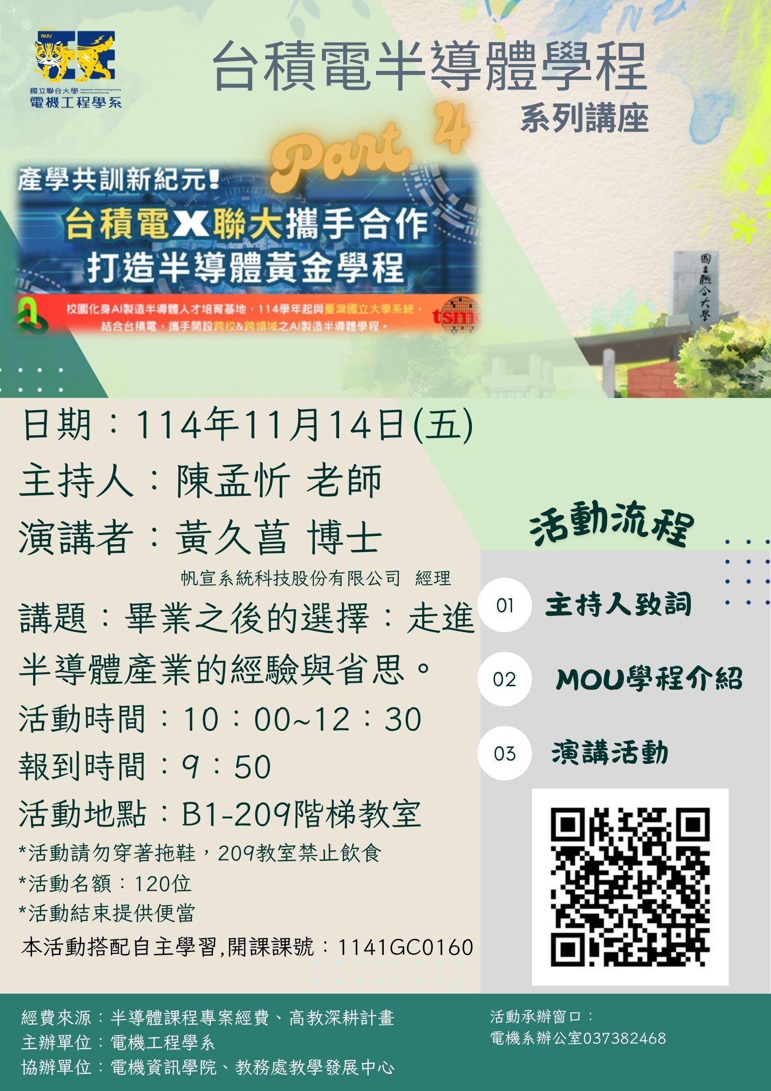 電機系【半導體講座活動系列】:台積電半導體學程演講最終場11/14