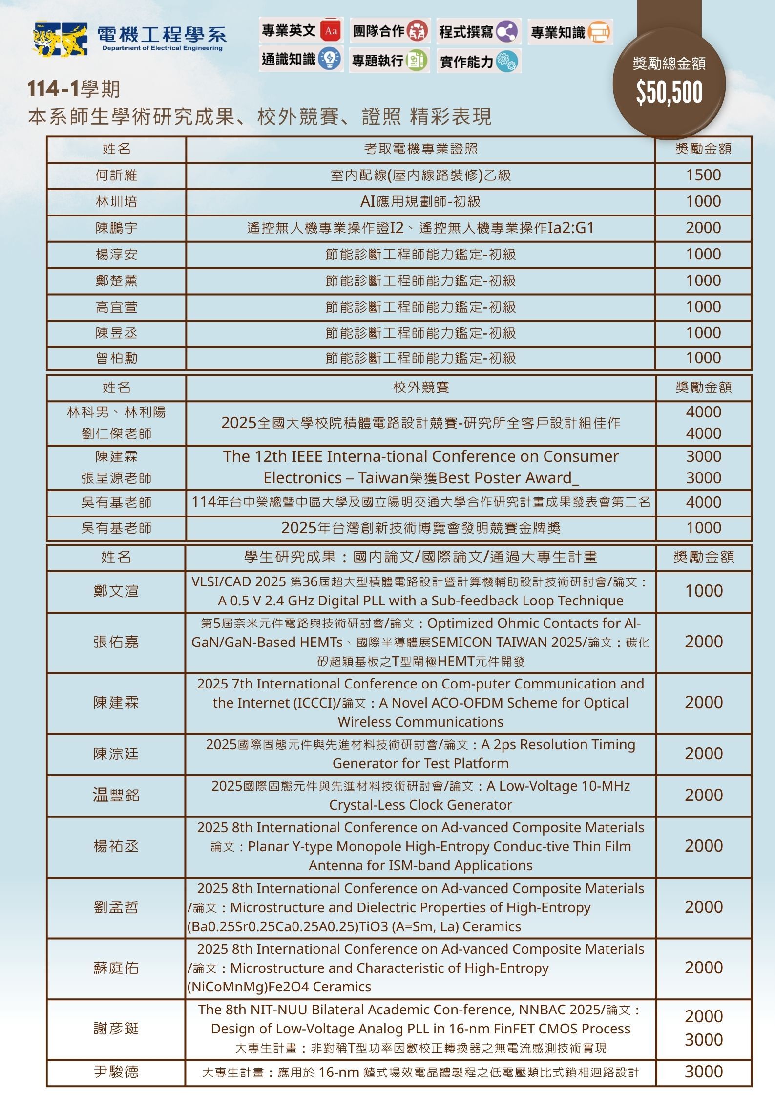 賀~114-1學期本系師生學術研究成果、校外競賽、專業證照考取獎勵公告