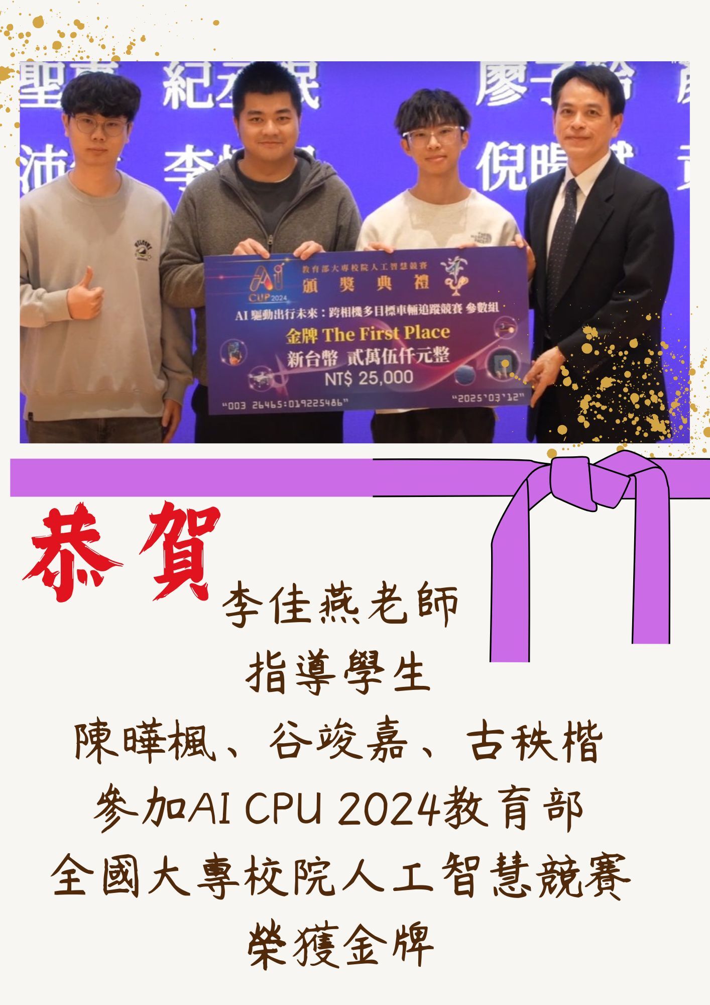 賀~李佳燕老師指導學生參加AI CPU 2024教育部全國大專校院人工智慧競賽榮獲金牌(114.3.12)(jpg)